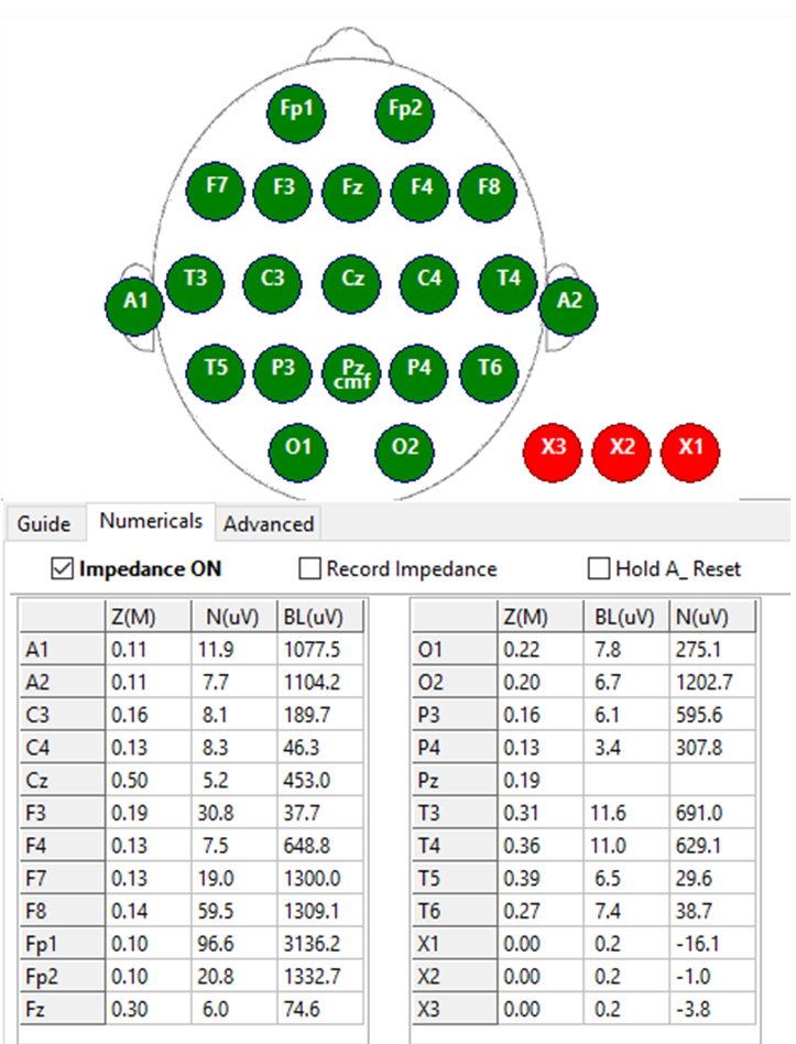 Target good (green) impedance on all channels before recording.