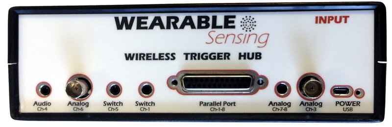 The Trigger Hub consolidates up to 8 independent trigger sources into a single output connected to the DSI headset — via wired cable or wireless receiver. It is used when you need more than one trigger source or require inputs that the MMBT-S alone does not support.